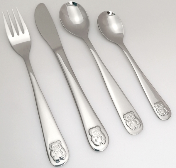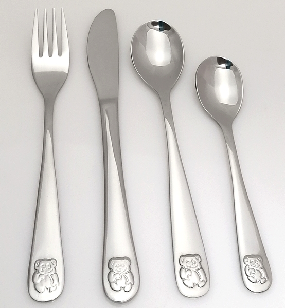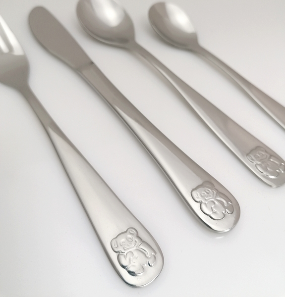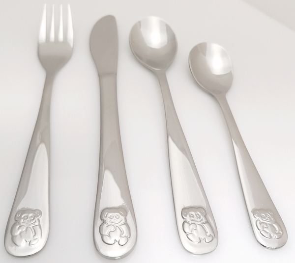 Completo di posate destinate ai bambini. Sono studiate per adattarsi alle manine dei bambini e sono lavabili in lavastoviglie.Il completo è imballato in una scatola decorativa.